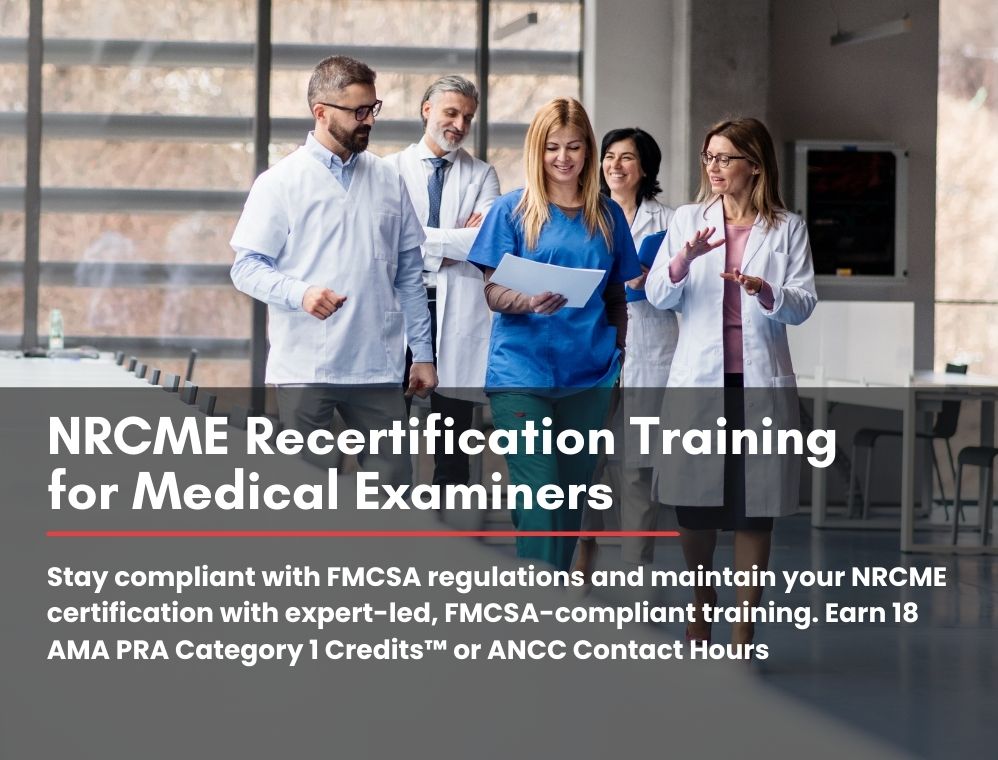 Stay compliant with FMCSA regulations and maintain your NRCME certification with expert-led, FMCSA-compliant training. Earn 18 AMA PRA Category 1 Credits™ or ANCC Contact Hours.